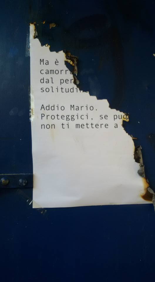 Queste le parole che conteneva il manifesto che avevamo affisso per ricordare Mario Piccolino e che questa mattina abbiamo trovato incendiato...è proprio vero chi toglie soldi alla cultura arma la camorra! Saranno stati due balordi ma fa male lo stesso".